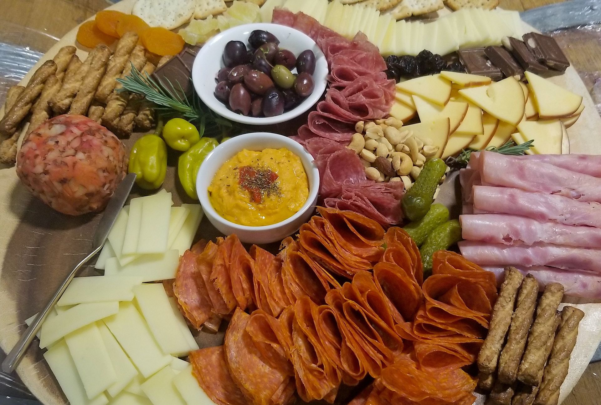 Deluxe grazing board, 2 hot appetizers, sparkling wine toast, and tasting flight of 3 wines.